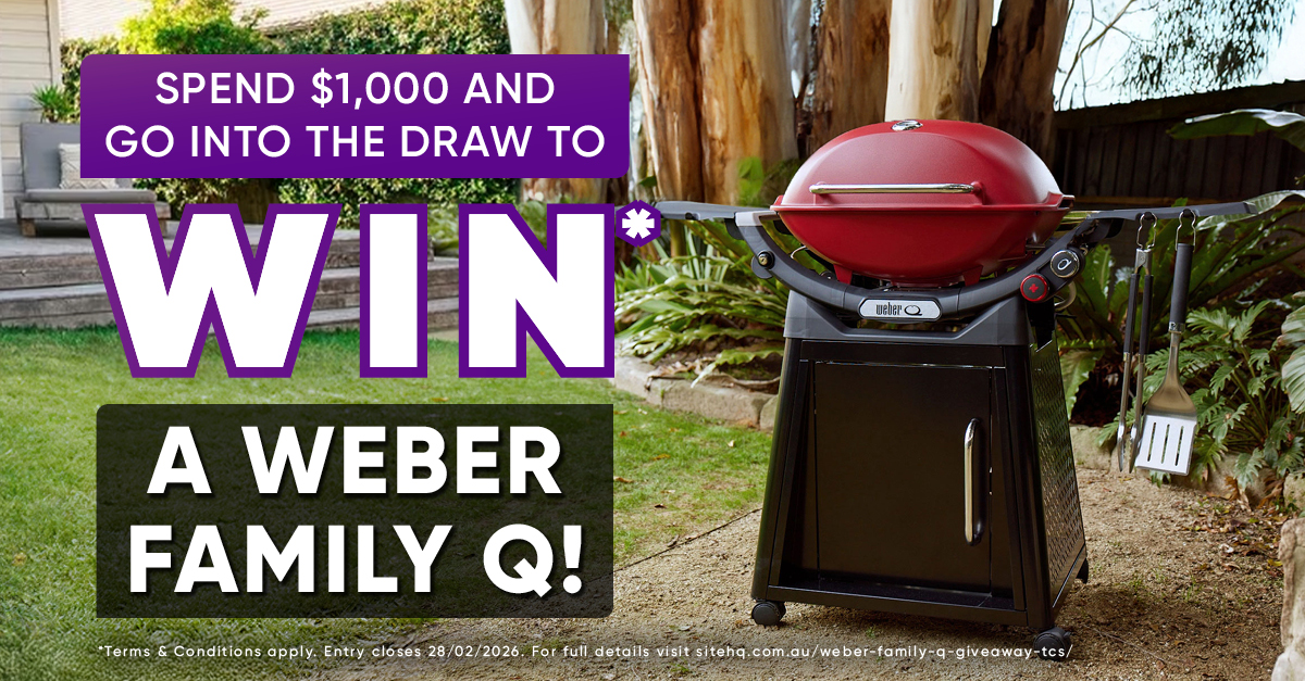 For a limited time, every online purchase over $1,000 (excluding GST & delivery) automatically puts you in the draw to win a Weber Family Q—perfect for job-site smokos or weekend cook-ups.